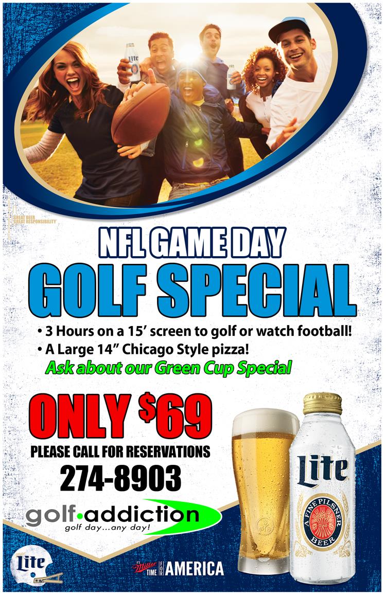 CHECK THIS DEAL OUT! THIS IS A $164 PACKGE FOR ONLY $69! THAT'S A $95 SAVINGS! Get to Golf Addiction on Thursdays, Sundays and Mondays for this great offer! 3 Hours on the Simulator to Golf and watch your team play on one of the several 60" TV’s or rent the Big SimSurround to watch them play on the side screens while you golf! PLUS you get a 14" Chicago style pizza with this package! PLUS take advantage of one of our great drink specials that day! Like $1 PBR Pounders on SUNDAYS!! Call today to reserve your Simulator!