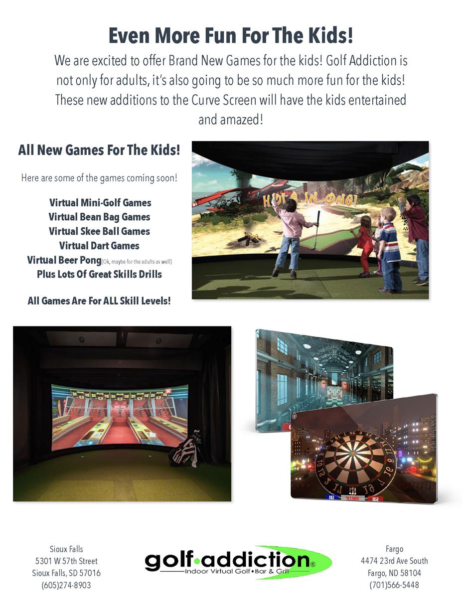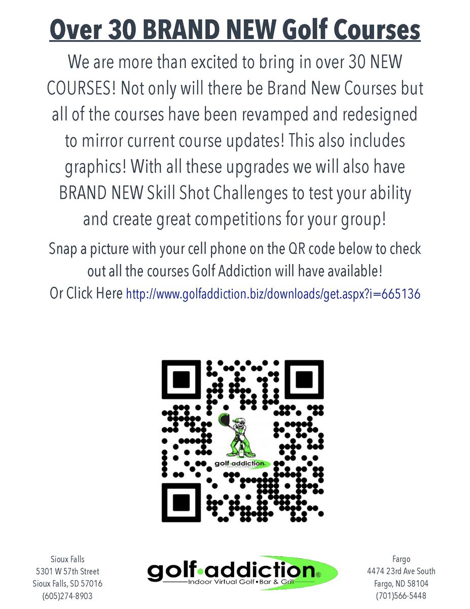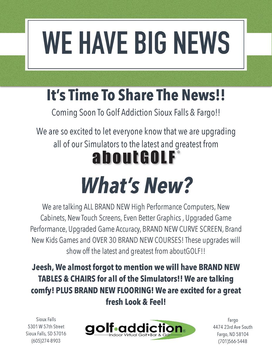 Golf Addiction is excited to announce that we will be completing a full upgrade to all of our Simulators!! These upgrades will not only include an additional 30 courses, but it will also include performance upgrades! What's new? Man, we are glad you asked! We are talking ALL BRAND NEW High Performance Computers, New Cabinets, New Touch Screens, Even Better Graphics, Upgraded Game Performance, Upgraded Game Accuracy, BRAND NEW CURVE SCREENS, Brand New Kids Games and Over 30 BRAND NEW COURSES!! We couldn't be more excited to bring you all the latest and greatest from aboutGOLF!